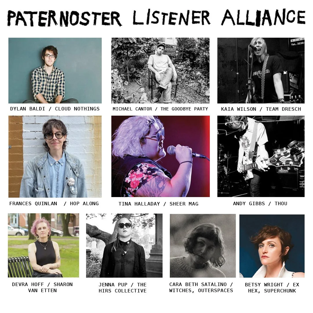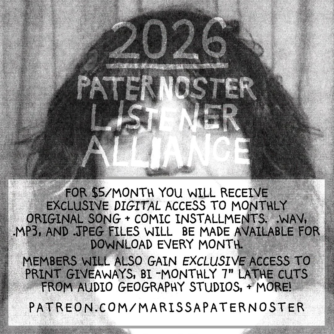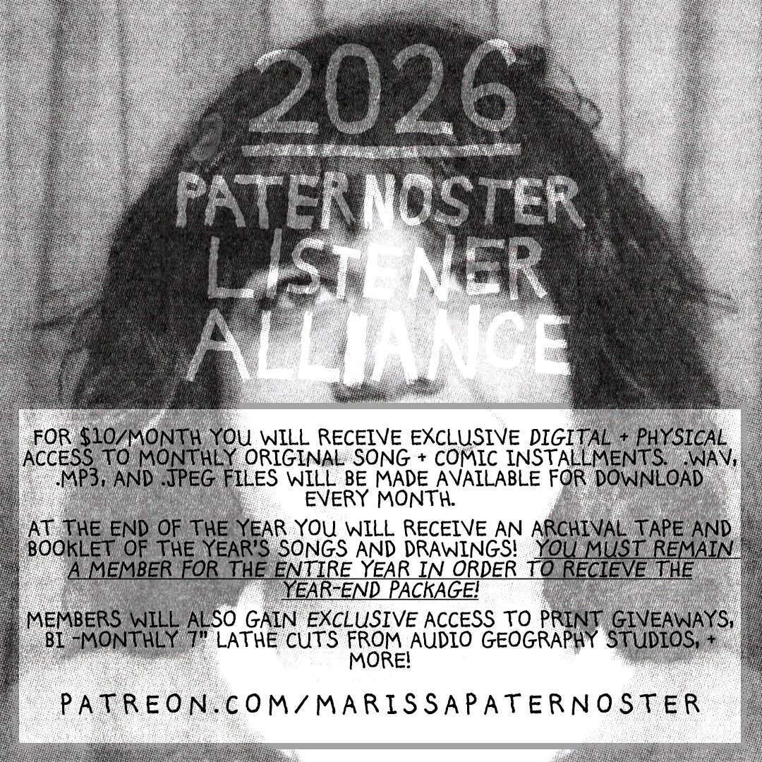 The Paternoster Listener Alliance is a recording project wherein I, Marissa Paternoster, write and record one original song every month for the foreseeable future until I die, start writing shitty songs, or I am begged by the public to stop. PLA members are mailed an archival tape & booklet of drawings at the end of each calendar year. Click here to check out the PLA Patreon page and please consider joining!